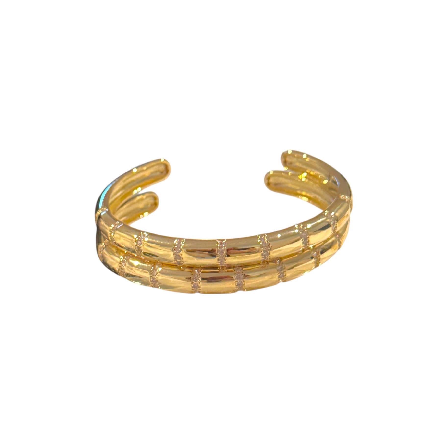 The Venus Royal Gold Bangle is that effortless, everyday piece you never want to take off. Designed in a smooth open-cuff style and finished with clear cubic zirconia accents, it adds a subtle shine that gives your stack that perfect finishing touch.