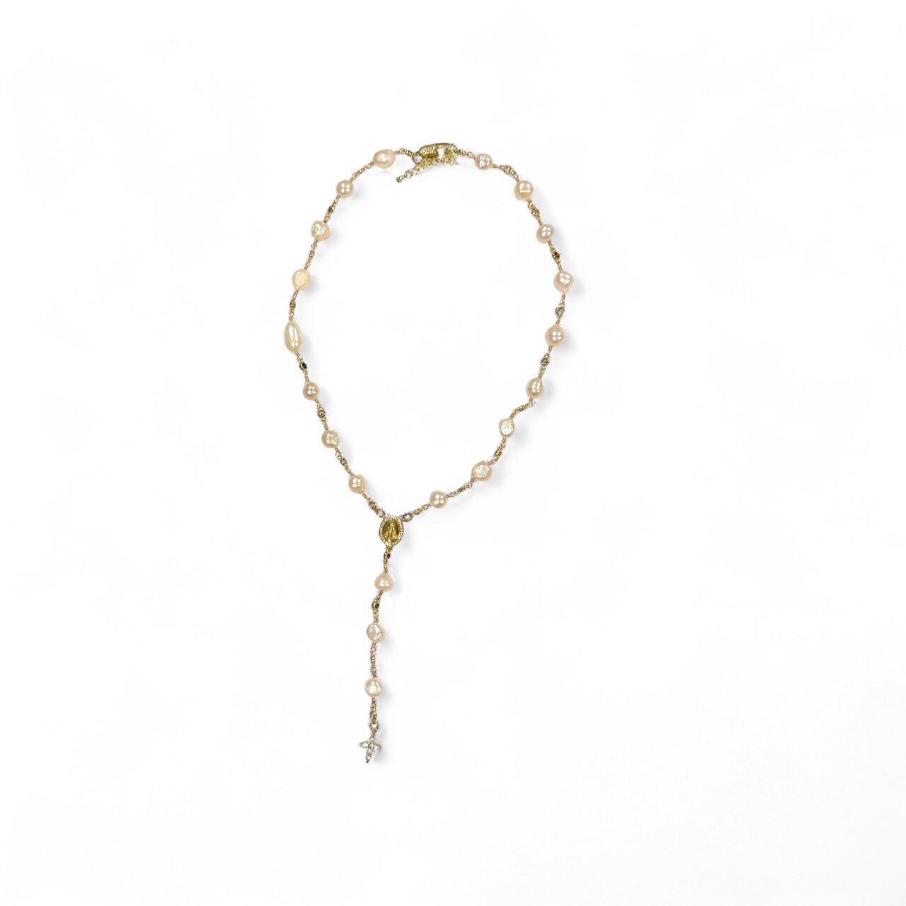Inspired by the grace and devotion of the Holy Rosary, the María Rosario Pearl Lariat Necklace celebrates faith and timeless elegance. Handcrafted with radiant freshwater pearls, this delicate design features a rosary-style center with Our Mother Mary medallion and a zirconia cross drop, symbolizing love, purity, and prayer.